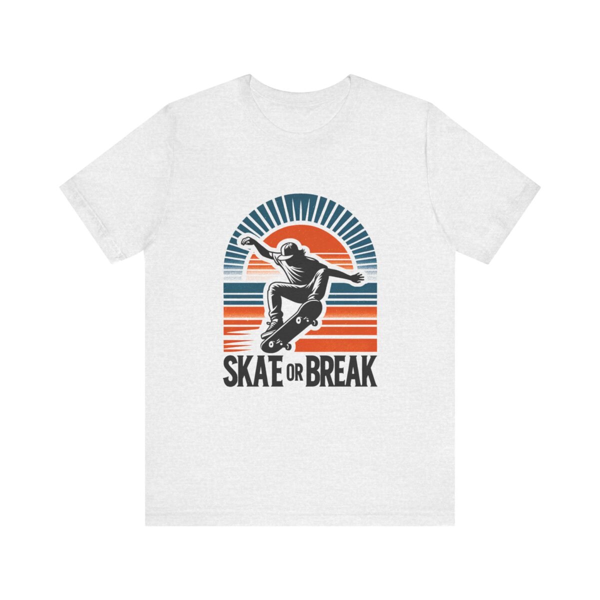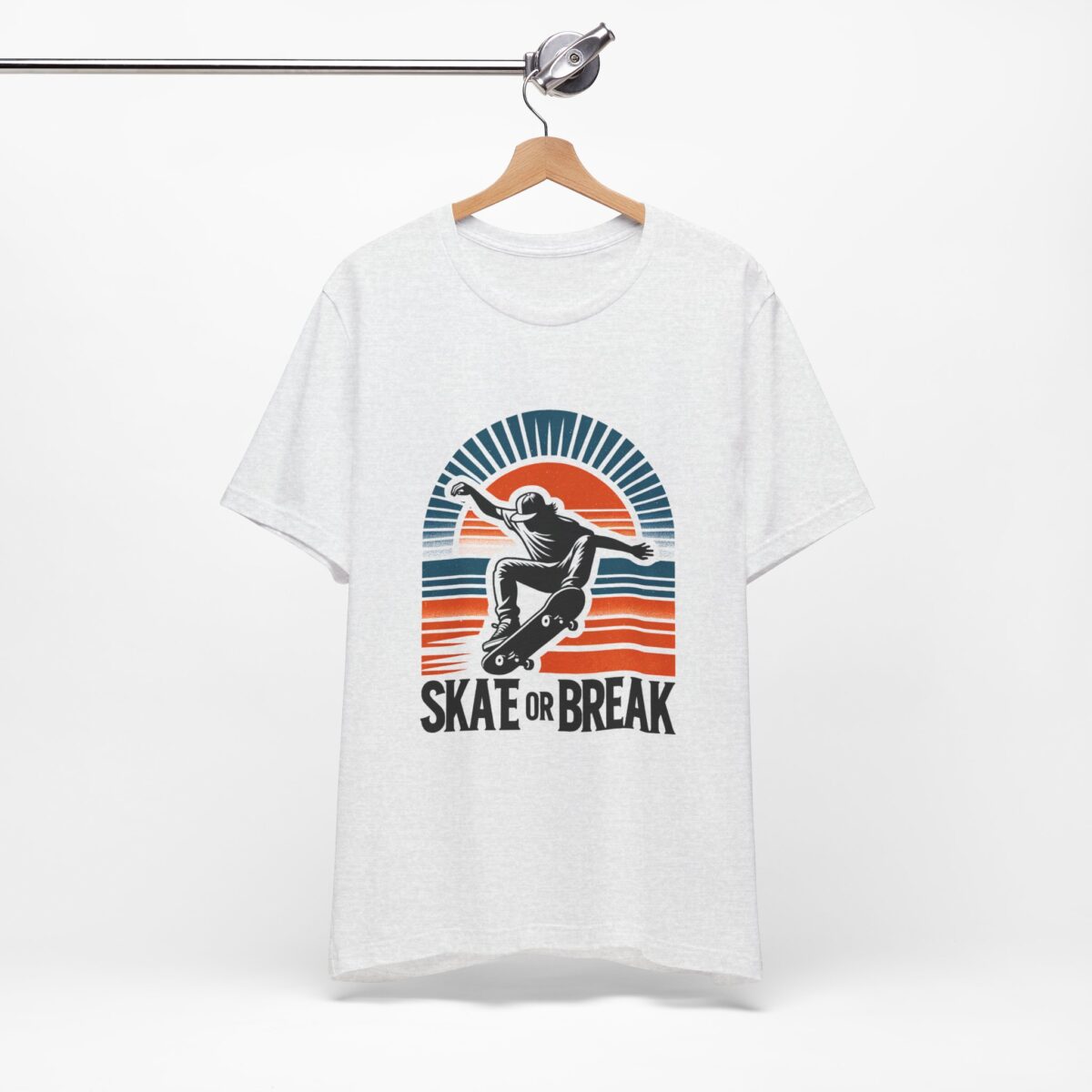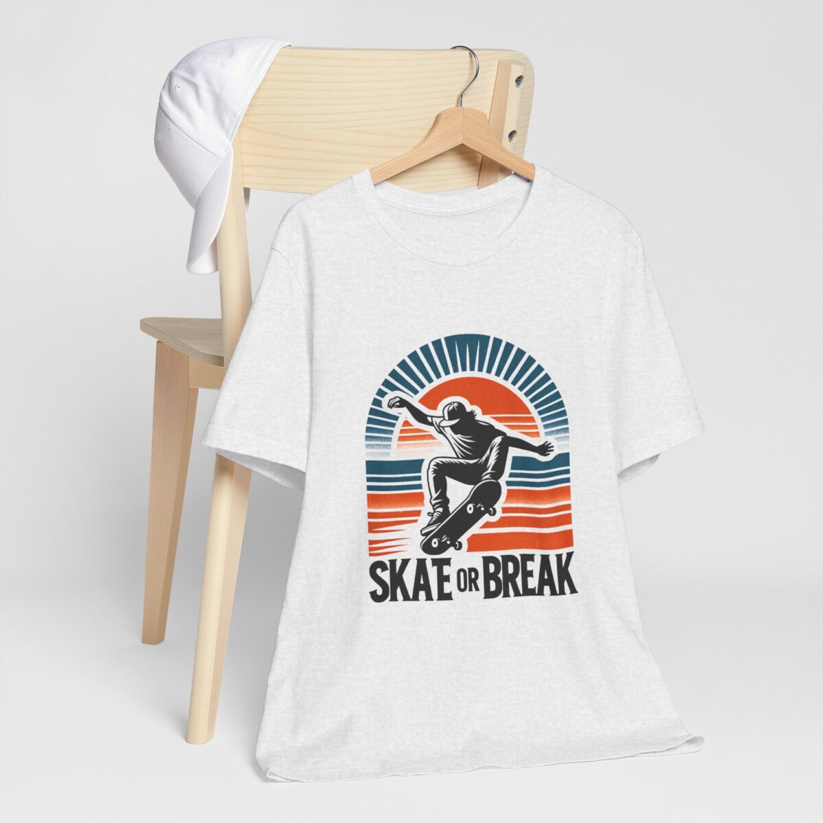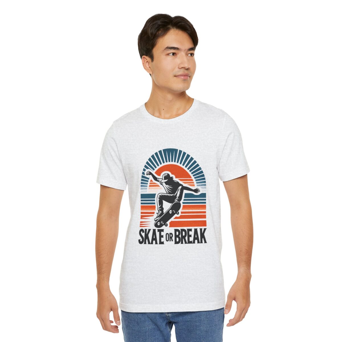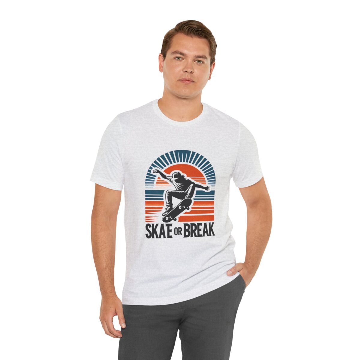 Introducing the “Skates or Break” T-Shirt – a classic unisex jersey short sleeve tee that captures the spirit of skateboarding with a bold statement. Designed to fit like a well-loved favorite, this shirt combines soft cotton and high-quality printing, making it a piece you’ll fall in love with over and over again. With ribbed knit collars for enhanced shaping and tapered shoulders for a better fit, this tee offers lasting comfort and style that improves with every wear.